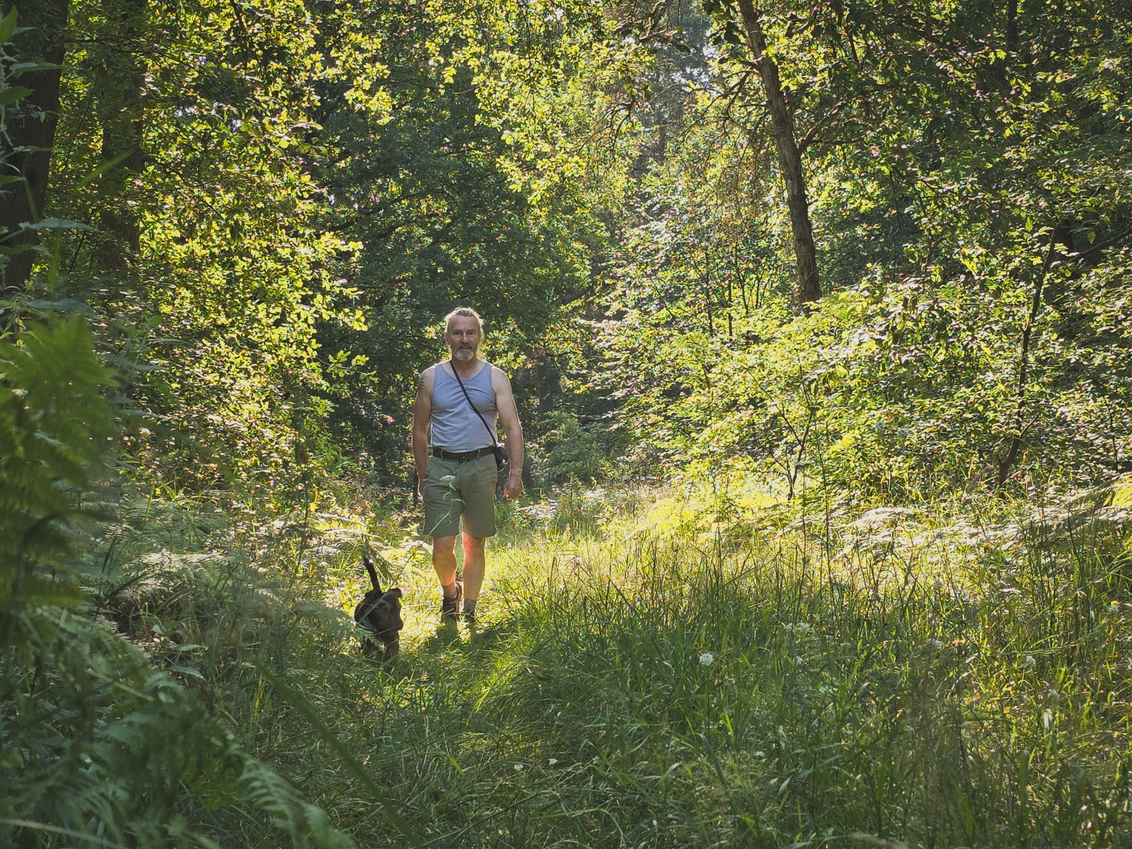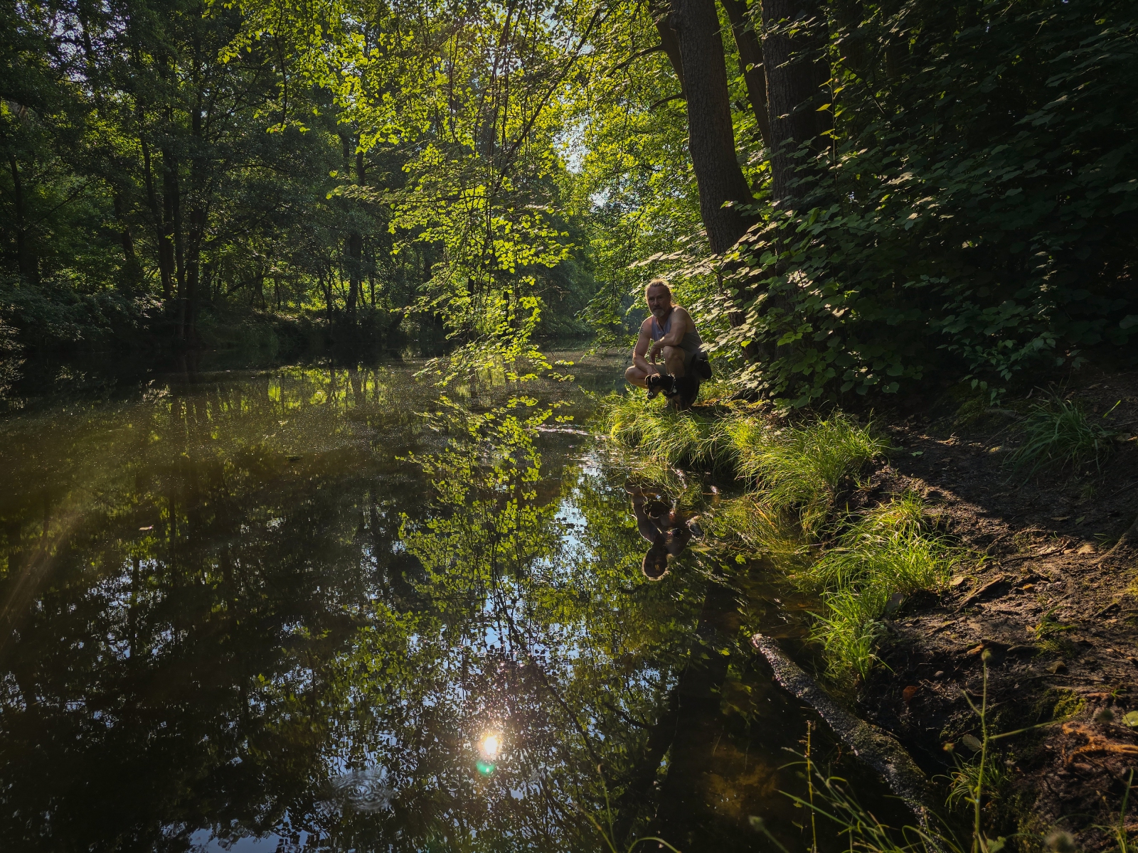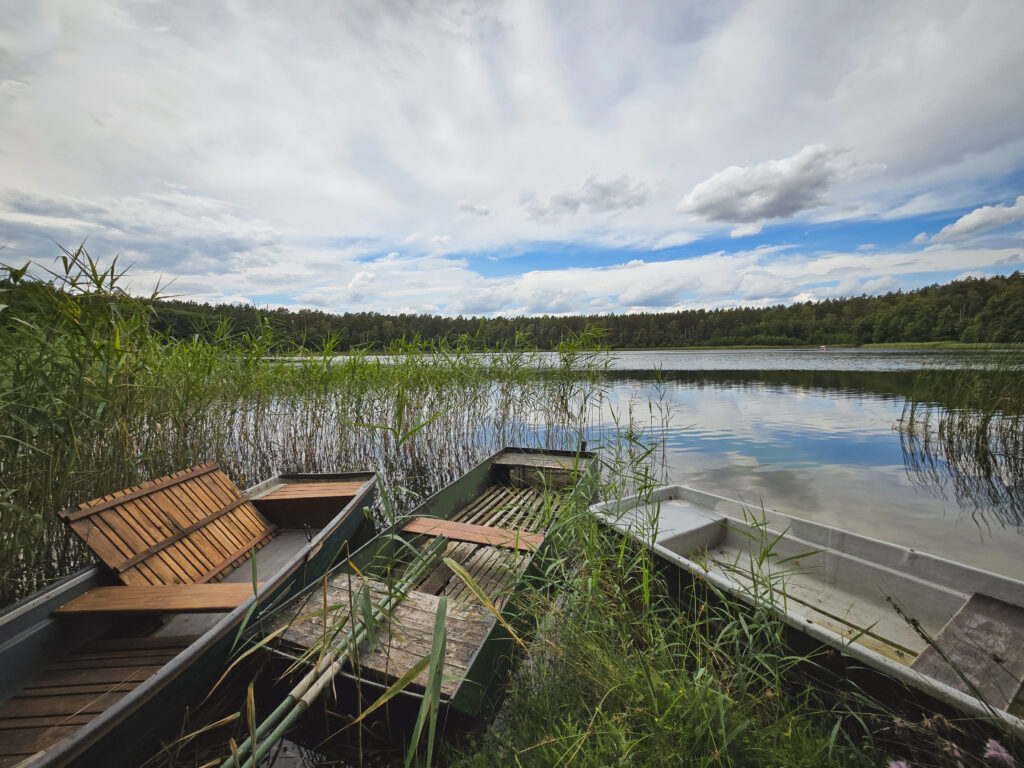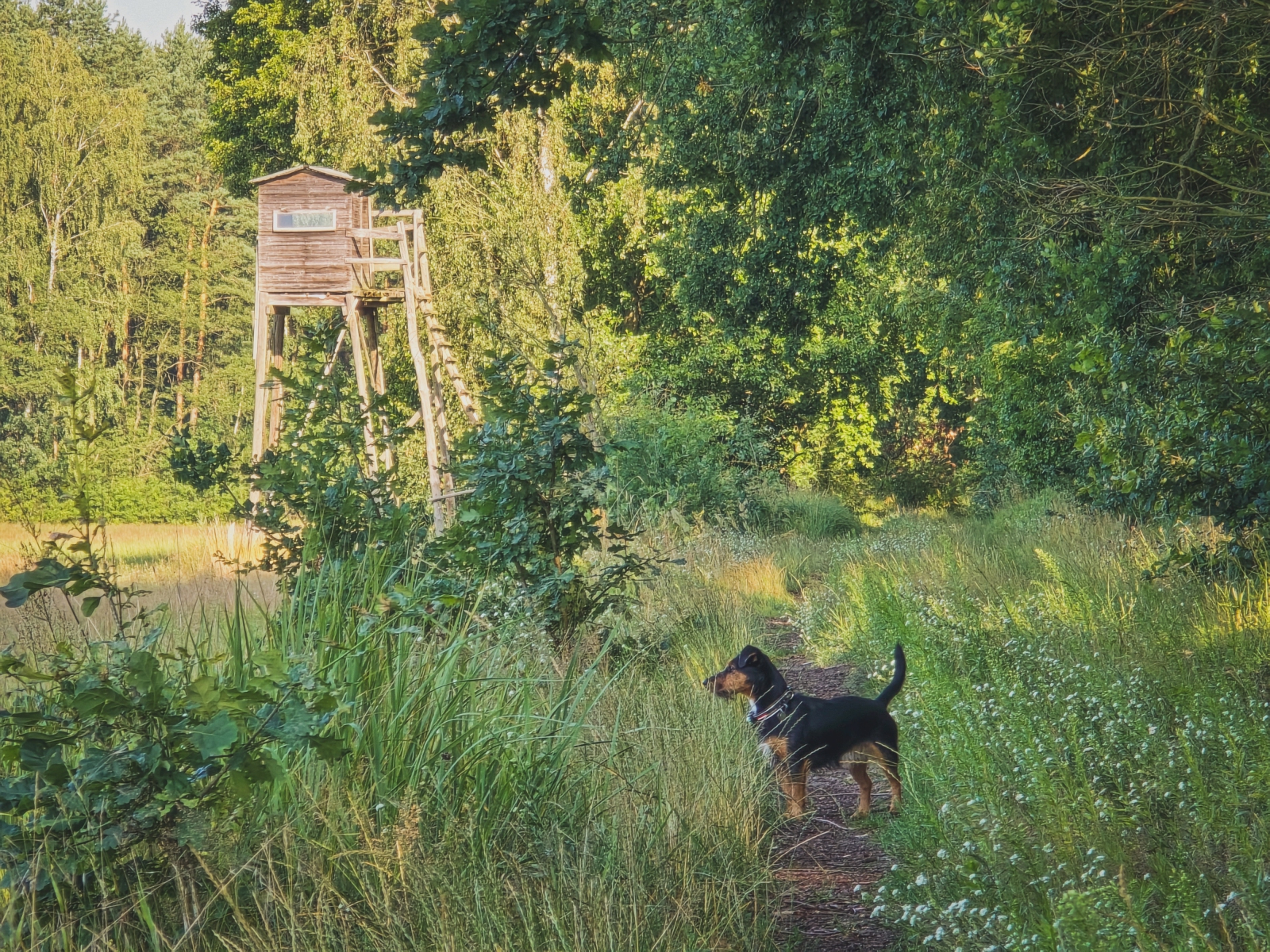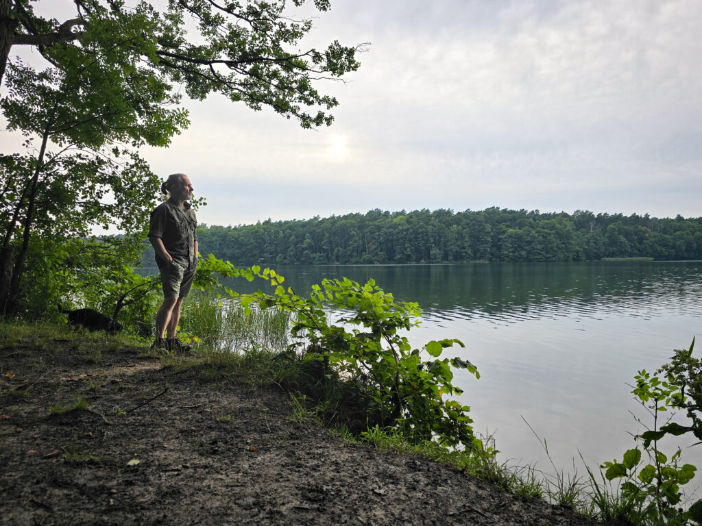 Der Stellplatz war aber neu. Wie ich überhaupt irgendwie immer wieder versuche, neue Plätze ausfindig zu machen. Der Platz lag abseits einer Hauptstraße und war ein guter Ausgangspunkt für Wanderungen. Diese war dann auch schnell mit Komoot geplant und Fritzi bekam schnell Gelegenheit, sich im Wald auszutoben. Auch hier gab es nicht wenige Mücken, allerdings war ich diesmal besser vorbereitet und hatte mich mit Mückenschutz präpariert. Die Wanderung, die ich so ähnlich bereits schon mal gemacht hatte, führte durch eine wunderschöne, abwechlsungsreiche Waldlandschaft . Diese war das Jagdrevier des ehemaligen Regenten der DDR, Erich Honecker. Der Weg ging zwischen zwei Seen (Kleiner und Großer Pinnowsee) hindurch. Dort gab es auch eine Badestelle, die einlud, nun doch mal den Sprung ins Nass zu wagen. Fritzi schien sagen zu wollen „na endlich!“.