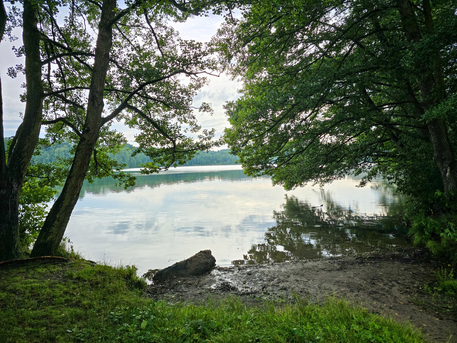 Die Nacht war ruhig, sodass ich am Morgen voller Tatendrang war und mich auf eine kleine Wanderung um den See machen wollte. Die Lust auf ein Bad allerdings war mir vergangen, da die Temperaturen zurückgegengen waren und es zudem windig war. Der See selbst war wieder einer dieser typisch brandenburgischen Seen, der von Buchen gesäumten Hügeln umgeben war. Das Wassser war glasklar und die Uferbereiche waren sandig. Komoot zeigte mir, dass man eine Wanderung um den See machen konnte.