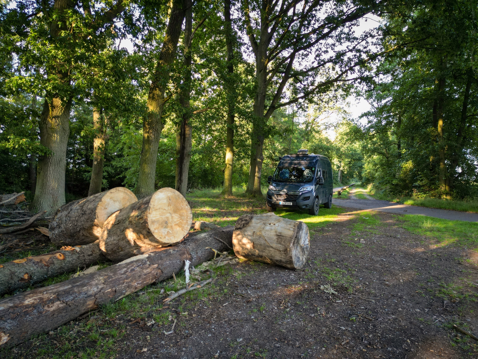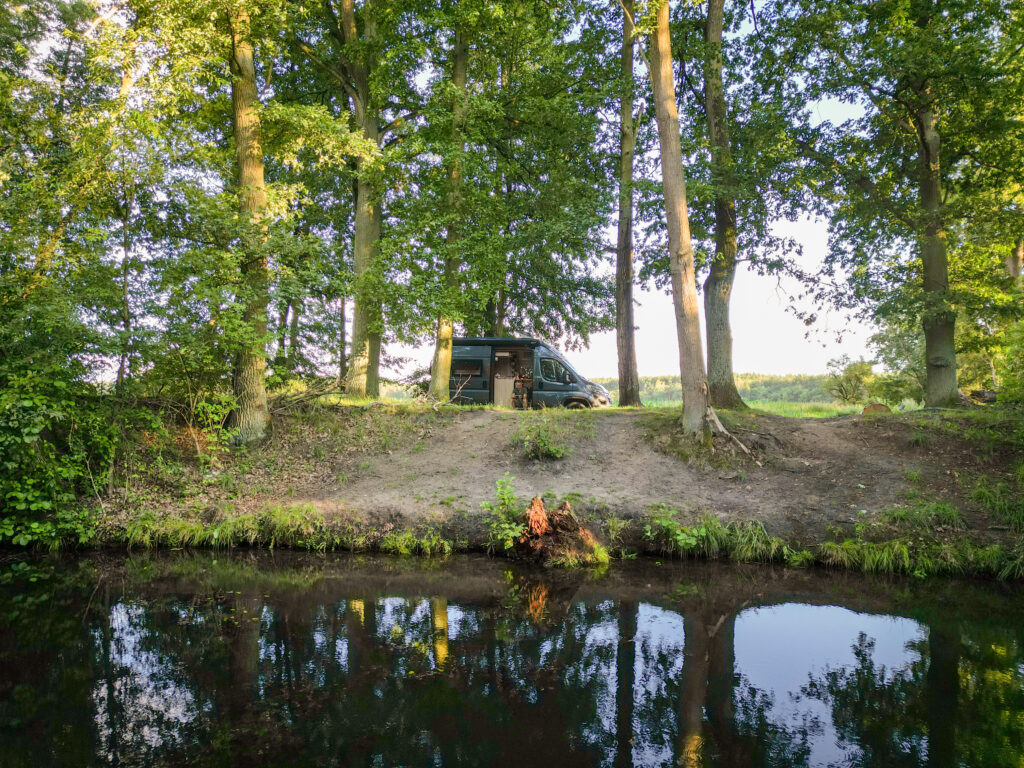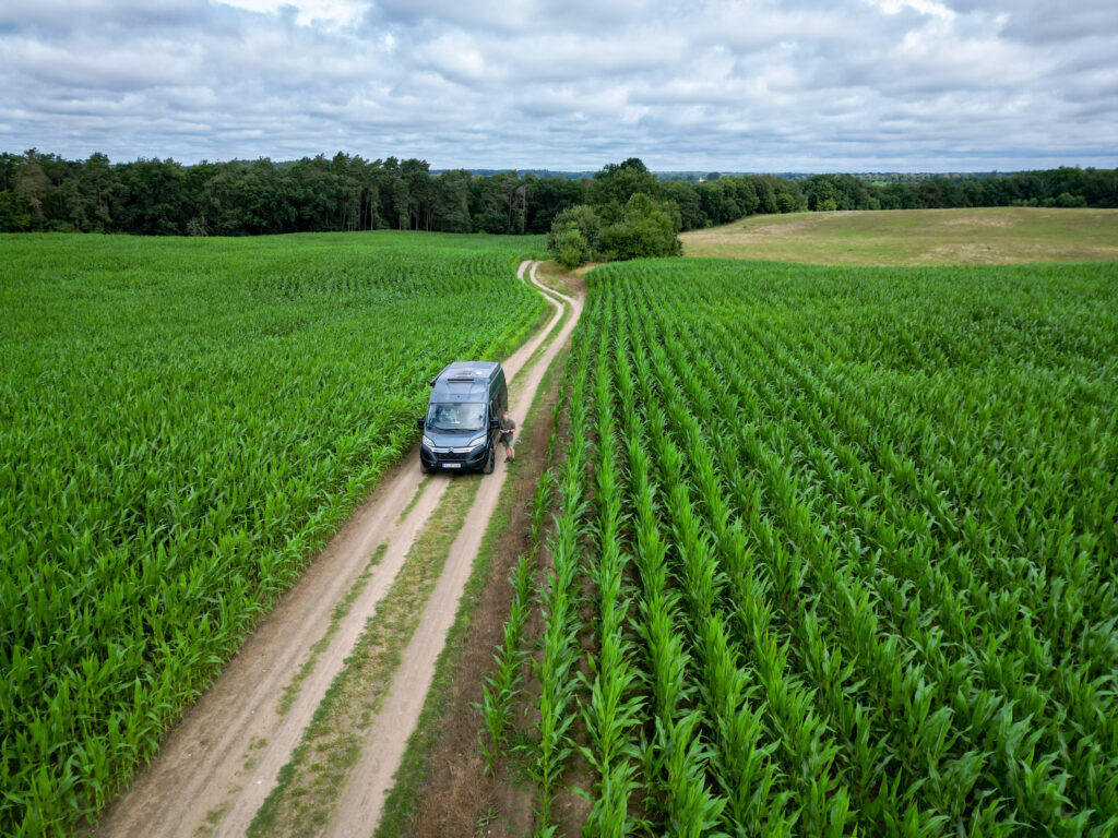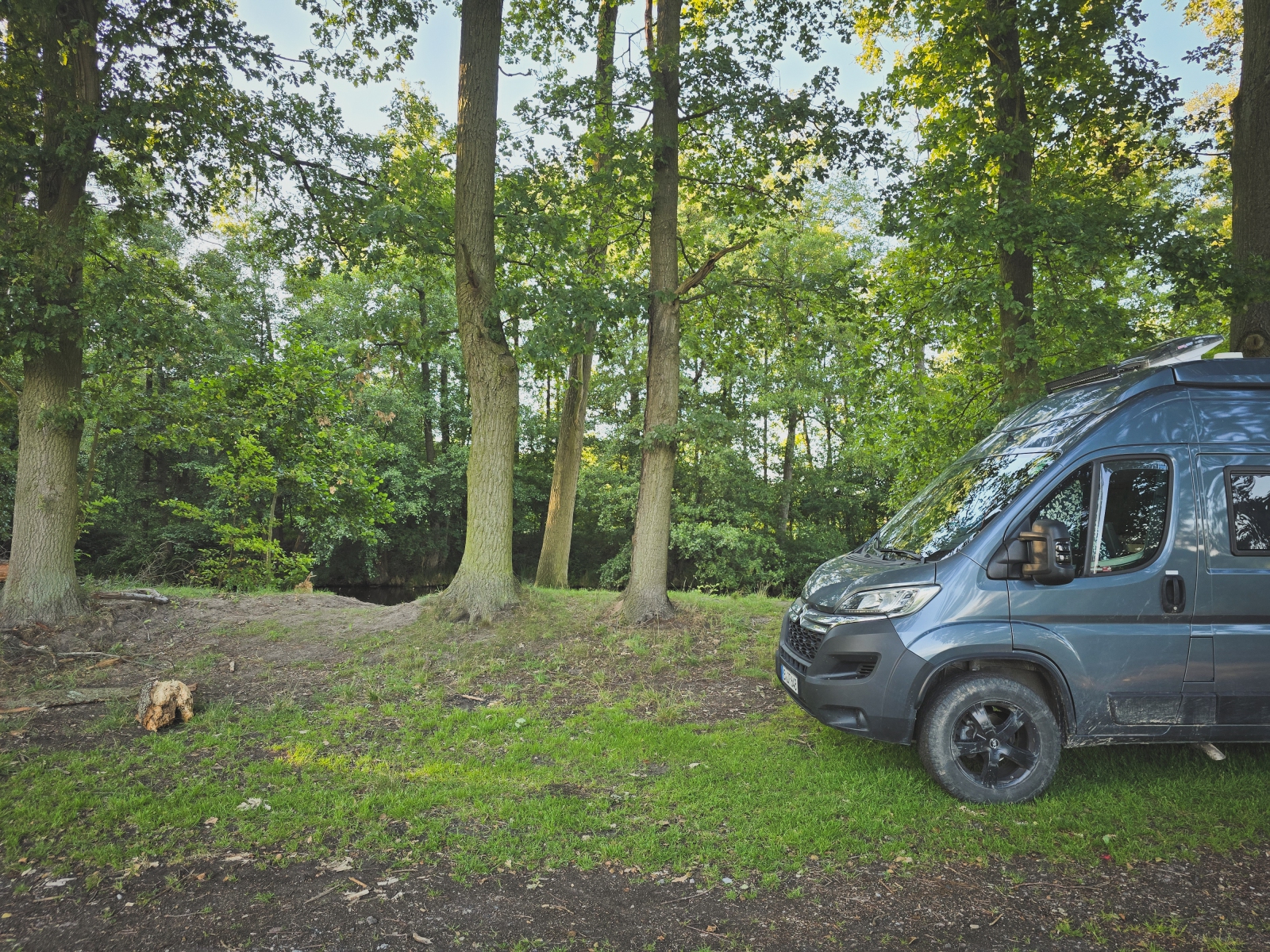 Da ich keine große Lust mehr hatte, lange durch die Gegend zu fahren, sollte es ein Stellplatz sein, der nicht so weit entfernt lag. Mein geschultes Auge wurde schnell auf Google Maps fündig. Allerdings lag dieser recht nah an der A11, der vielbefahrenen Autobahn in Richtung Norden. Der Weg zum Stellplatz führte mich auf einem Sandweg durch weite Maisfelder. Die Sorge wegen Verkehrslärm stellte sich dann als unbegründet heraus. Wir waren offenbar weit genug weg, der Wind stand günstig und den Rest verschluckte die Topographie. Bei einem kurzen Spaziergang kam ich zu dem Schluss, dass wir wieder mal einen wirklich schönen Stellplatz gefunden hatten und freute mich auf ein Bad im nahen See am nächsten Morgen.