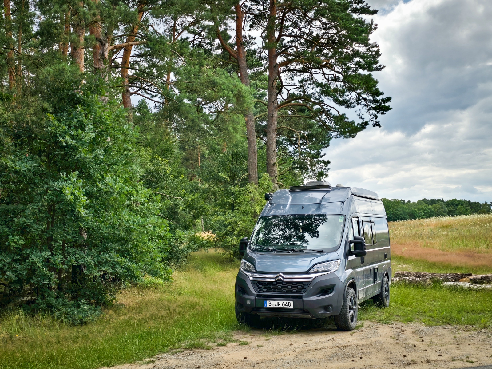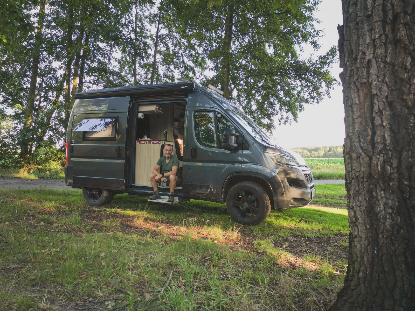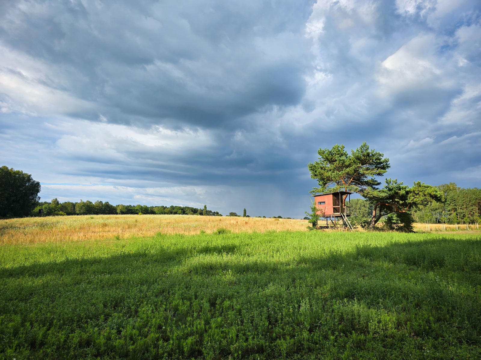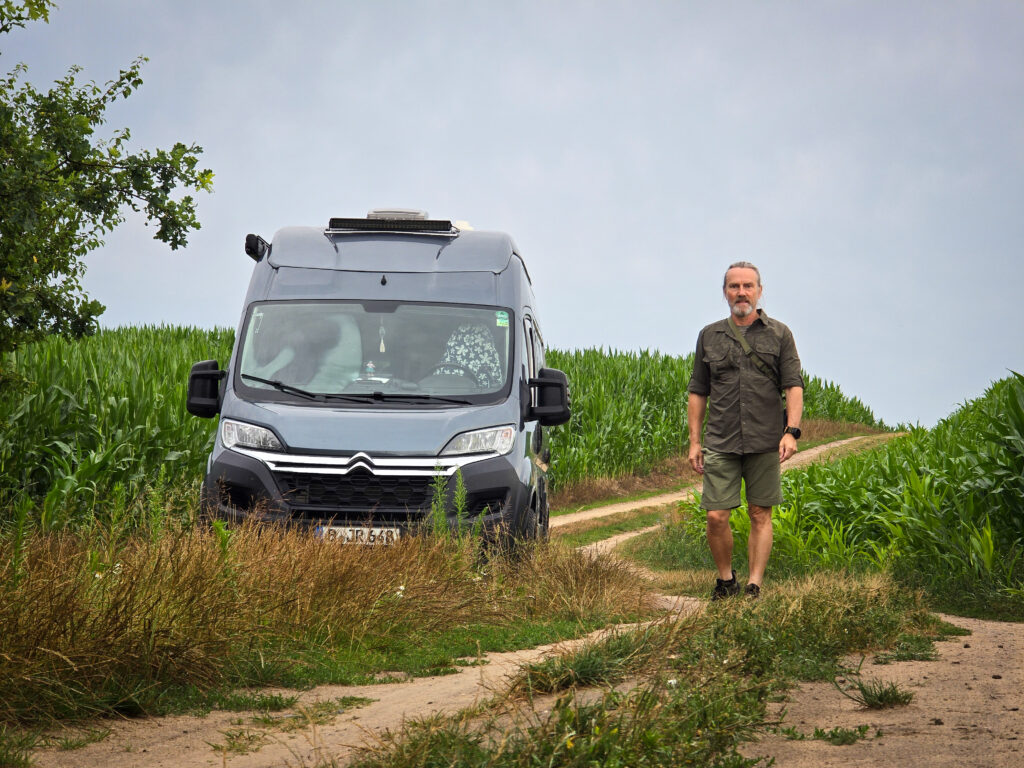 Da ich keine große Lust mehr hatte, lange durch die Gegend zu fahren, sollte es ein Stellplatz sein, der nicht so weit entfernt lag. Mein geschultes Auge wurde schnell auf Google Maps fündig. Allerdings lag dieser recht nah an der A11, der vielbefahrenen Autobahn in Richtung Norden. Der Weg zum Stellplatz führte mich auf einem Sandweg durch weite Maisfelder. Die Sorge wegen Verkehrslärm stellte sich dann als unbegründet heraus. Wir waren offenbar weit genug weg, der Wind stand günstig und den Rest verschluckte die Topographie. Bei einem kurzen Spaziergang kam ich zu dem Schluss, dass wir wieder mal einen wirklich schönen Stellplatz gefunden hatten und freute mich auf ein Bad im nahen See am nächsten Morgen.