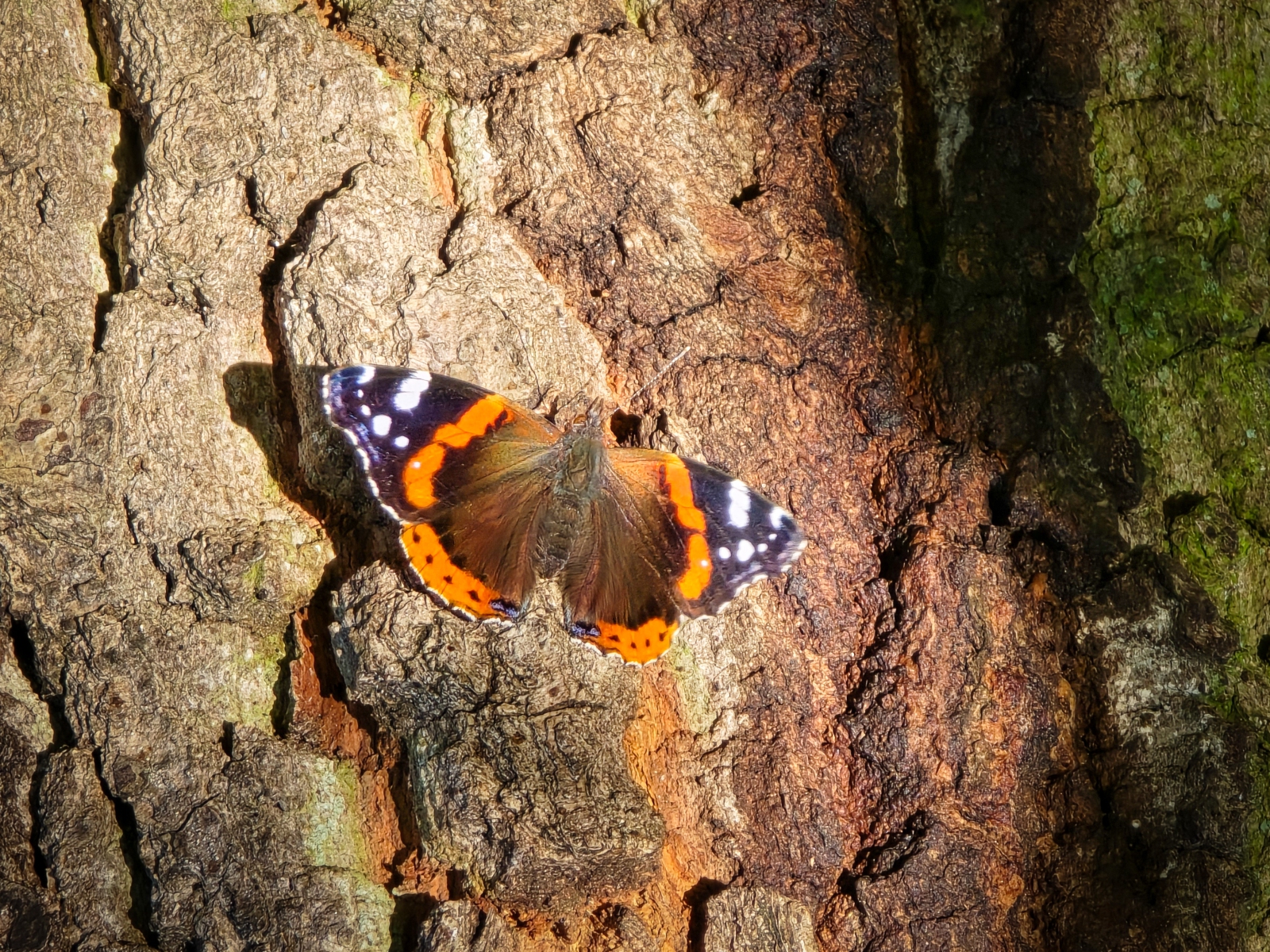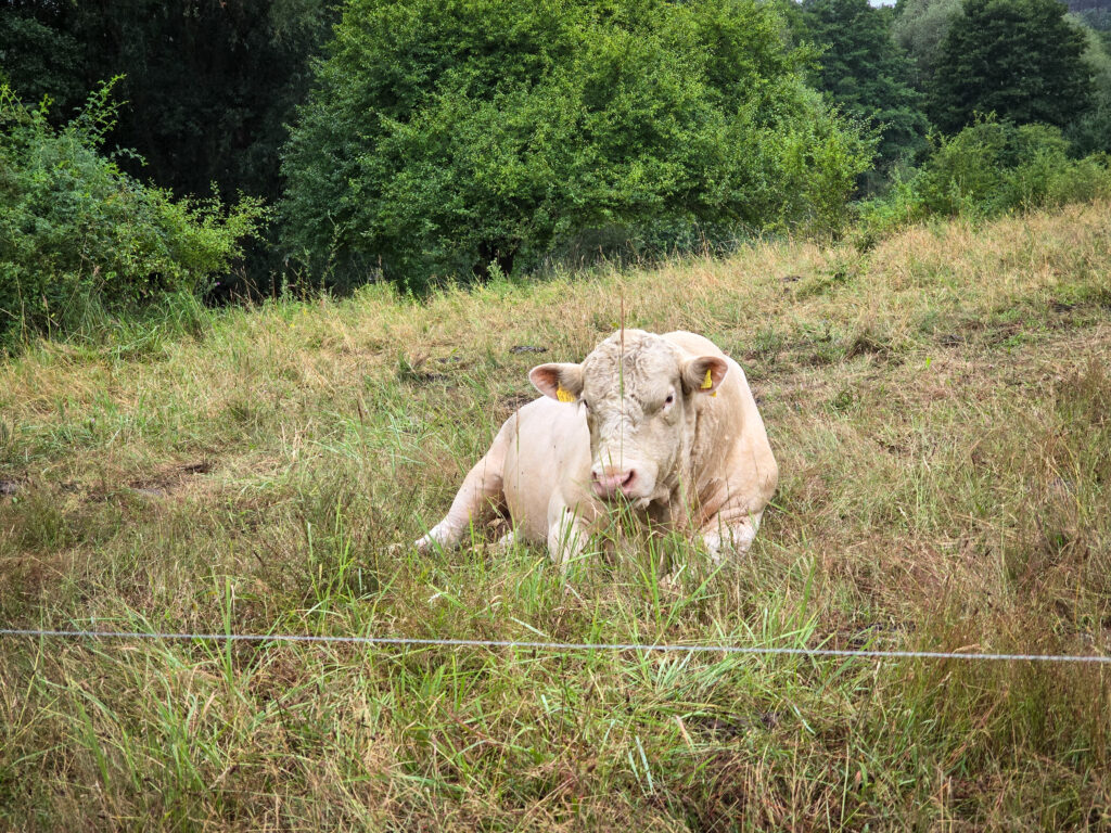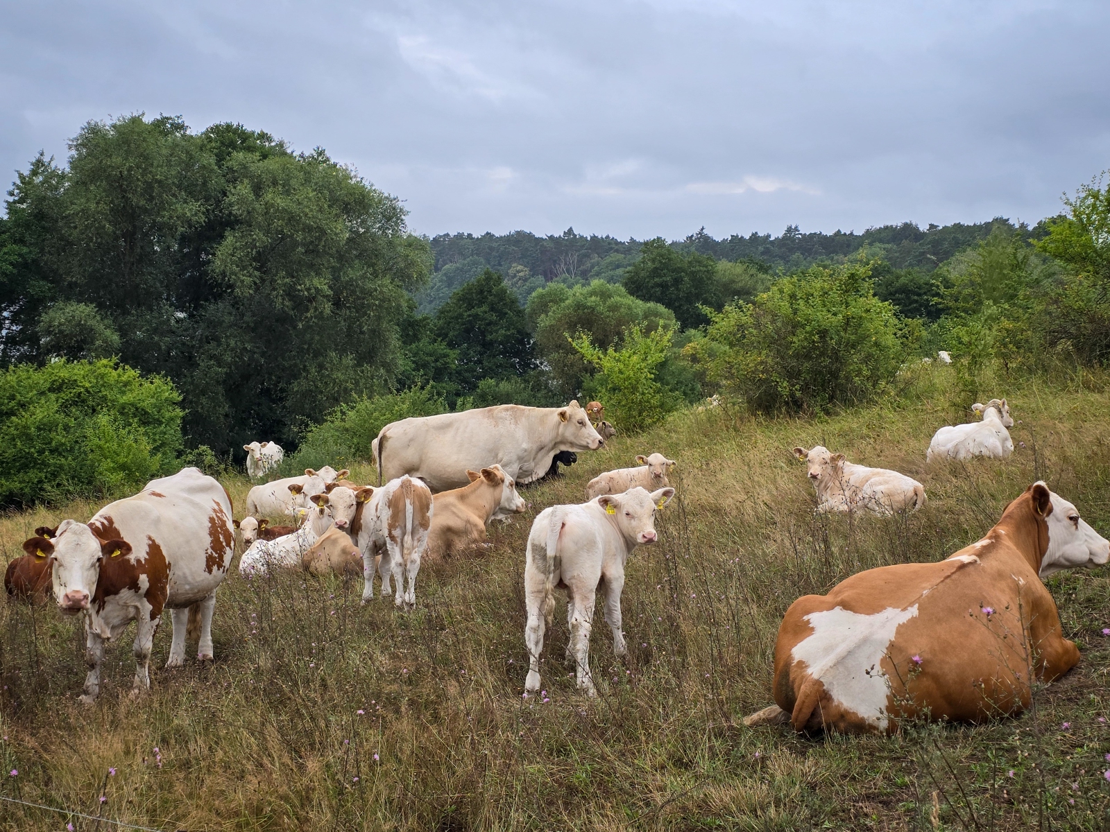 Was Komoot mir nicht zeigte war, dass auf der gegenüberliegenden Seeseite eine Weide war, die mit Elektrozaun abgegrenzt war. Frische Hinterlassenschaften wiesen darauf hin, dass sich irgendwo Kühe befinden mussten. Da ich keine Lust hatte, den ganzen Weg wieder zurückzugehen, setzten wir ihn über die Weide fort. Vorsorglich hatte ich mich schon einmal mit einem Stock „bewaffnet“ um allzu aufdringliche Vierbeiner auf Distanz zu halten. Ganz am Ende der Weide sah ich dann die Herde. Zum Glück war auch der schützende Elektrozaun nah, denn in der Herde waren Kälber und auch ein stattlicher Bulle. Zum Glück sahen sie in mir keine Gefahr und ließen uns unbehelligt unseres Weges ziehen.