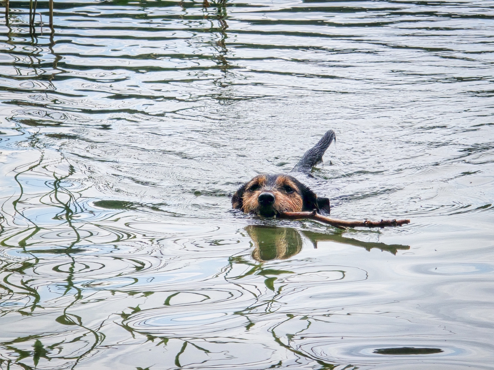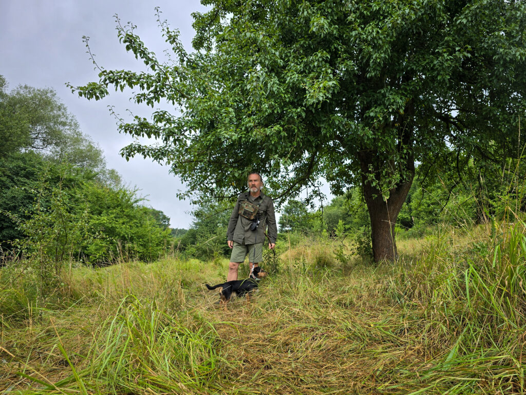 Gut erfrischt ging es dann wieder zu Olga. Allerdings hielt der Rückweg auch noch einen echten Stressmoment bereit. Wie wir so dahinwanderten, Fritzi ohne Leine, bemerkte ich vor Fritzi, dass sich in ca. 20 bis 30 Metern Entfernung von ihr Wildschweine abgelegt hatten. Die Begegnung mit Wildschweinen (und auch Wölfen) ist für mich so das Szenario, welches ich mir am Wenigsten wünsche. Fritzi war ungefähr 10 Meter von mir entfernt. Sie selbst hatte die 5 bis 10 Wildschweine nicht gewittert. Ich rief sie sofort zurück und normalerweise schaut sie dann erst mal, ob sie nicht irgendetwas Spannendes verpasst. In diesem Fall aber war meine Aufforderung wohl so eindeutig und unmissverständlich, dass sie gleich den Weg zu mir antrat. Zudem war es wohl so laut, dass die Wildschweine aufschreckten und sich (zum Glück) in das nahe Dickicht zurückzogen.
