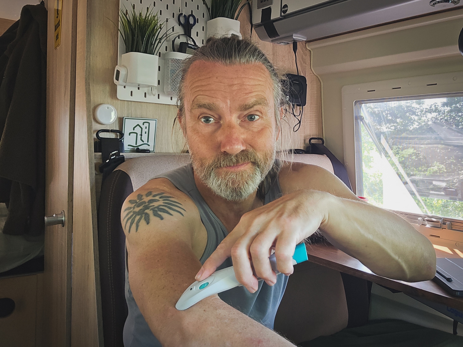 Aber erst mal konnte ich daran nichts ändern und widmete mich zunächst dem Kabel. Auch das war eine größere Herausforderung, denn mal so eben kann man kein Kabel von links vorne nach rechts hinten verlegen. Das ist mit viel Rumräumen und Fummelei verbunden. Nachdem ein Durchziehen auf der linken Seite unmöglich war, legte ich es von der Dinette in Richtung Küchenblock unter dem Echtholz-Laminat und von dort dann durch den Küchenblock nach hinten. Jetzt muss ich nur noch den alten Sensor demontieren und den neuen montieren. Hoffentlich passt das von den Löchern.