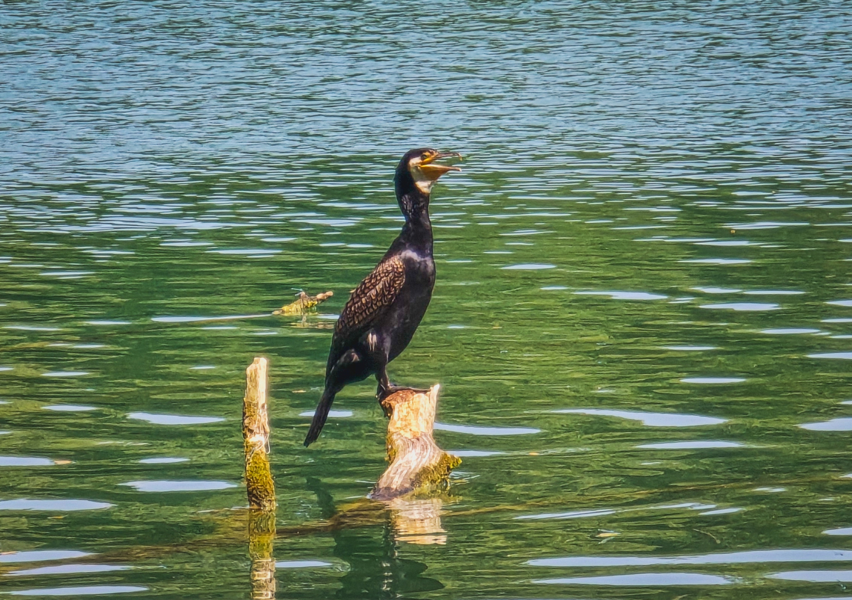Was Komoot mir nicht zeigte war, dass auf der gegenüberliegenden Seeseite eine Weide war, die mit Elektrozaun abgegrenzt war. Frische Hinterlassenschaften wiesen darauf hin, dass sich irgendwo Kühe befinden mussten. Da ich keine Lust hatte, den ganzen Weg wieder zurückzugehen, setzten wir ihn über die Weide fort. Vorsorglich hatte ich mich schon einmal mit einem Stock „bewaffnet“ um allzu aufdringliche Vierbeiner auf Distanz zu halten. Ganz am Ende der Weide sah ich dann die Herde. Zum Glück war auch der schützende Elektrozaun nah, denn in der Herde waren Kälber und auch ein stattlicher Bulle. Zum Glück sahen sie in mir keine Gefahr und ließen uns unbehelligt unseres Weges ziehen.